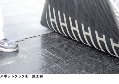 スポットタック工法は、合成繊維を使用した改質アスファルトルーフィングの裏面に部分粘着層が付いたスポットタックHCやスポットタックCを張付けることにより、防水層の 『破断』 『ふくれ』 防止につながるシステムで、熱アスファルトを使用せずに施工することから、環境対応をはかった工法です。