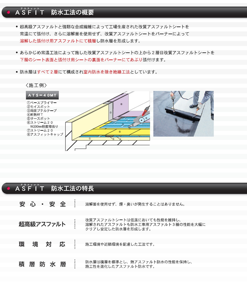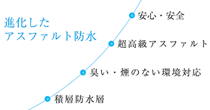 建築防水工法として、信頼性の高い熱アスファルト防水工法を進化させたASFIT防水工法を実現しました。